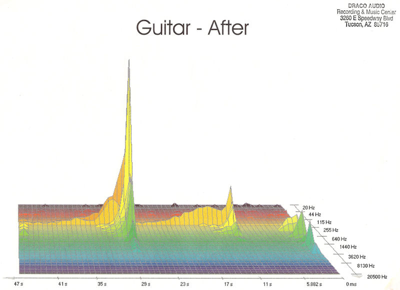 Guitar: In the photos of the Guitar Before and Guitar After, we see the opposite effect. For these photos, a chord was played. The predominant frequency of that chord shows up as yellow, and the other colors represent additional harmonics. Notice in the After photo, though, that there is a change in these other colors—there is a lot more of each of these colors, meaning that more of the chord's harmonics are now emanating from the guitar. VortexHealing had the effect of amplifying the additional harmonics of the chord, creating a fuller, richer sound in the guitar. There are even some additional harmonics at the top, in the dark red band that were not there at all in the Before photo.